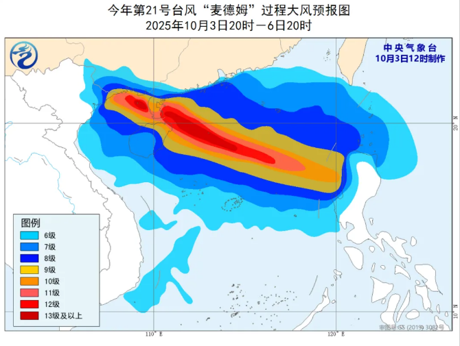 大风预报:3日夜间至6日白天,广东雷州半岛和中西部沿海、广西沿海、海南岛及沿海、西沙群岛、中沙群岛、黄岩岛附近海域将有6到8级风,南海中北部、琼州海峡、北部湾中北部有9到11级风,台风“麦德姆”中心经过的附近海域或地区风力可达12到14级、阵风15到17级。